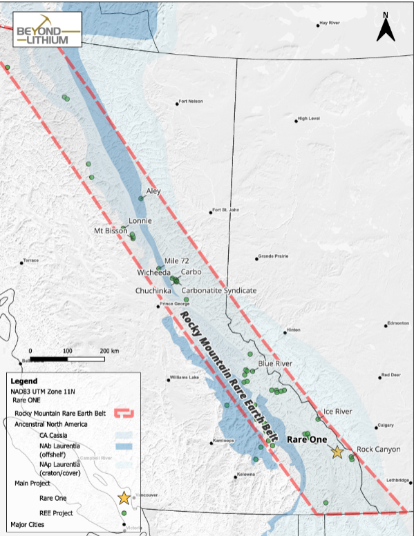 The Rare One Project covers a total area of 3,186 hectares and is located within the highly prospective Rocky Mountain Rare Earth Belt hosted in the Alkaline Province in British Columbia including the Wicheeda Deposit owned by Defense Metals (TSXV: DEFN) with mineral resources contain 29.2 Mt of Measured and Indicated resource at an average grade of 2.27% TREO (total rare earth oxide) and 5.5 Mt of Inferred resource at an average grade of 1.42% TREO 1 . The Alkaline Province stretches over 1,000 km in distance along the western flank of the Ancestral North America which has many projects hosting rare earth elements (“REEs”) and base-metal mineralization (Rukhlov 2024).